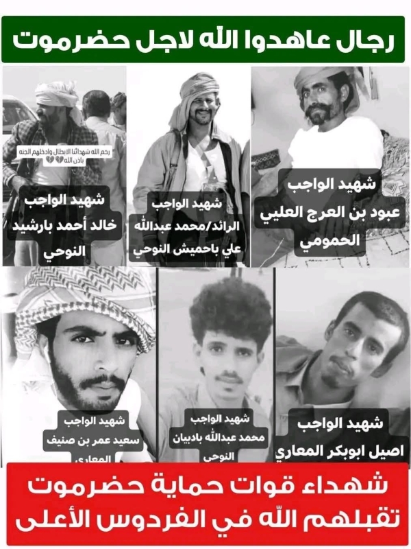 أعلنت قوات حماية حضرموت التابعة لحلف قبائل حضرموت، أسماء ستة من أفرادها سقطوا خلال المواجهات المسلحة الأخيرة مع قوات المجلس الانتقالي الجنوبي (الانفصاليين) في هضبة المحافظة.