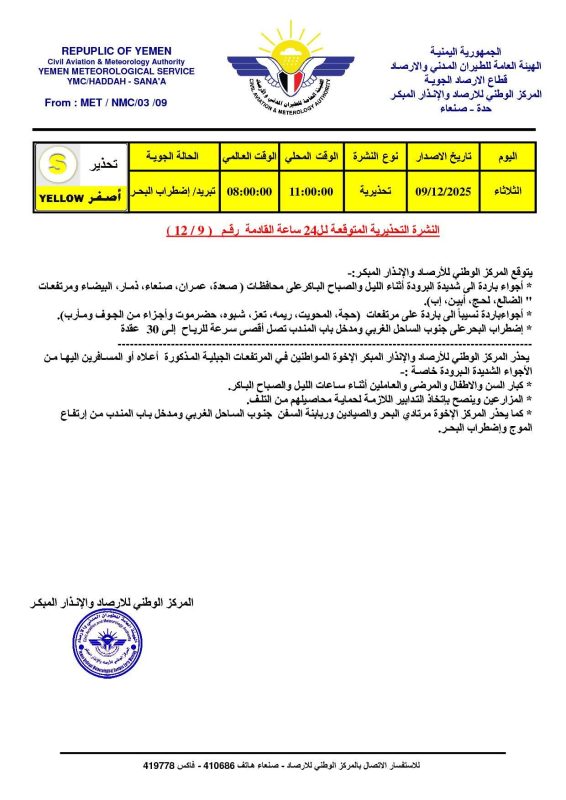 ووفق النشرة الجوية الصادرة عن المركز، من المتوقع أجواء باردة إلى شديدة البرودة أثناء الليل والصباح الباكر في محافظات صعدة، عمران، صنعاء، ذمار، البيضاء ومرتفعات الضالع ولحج وأبين وإب.