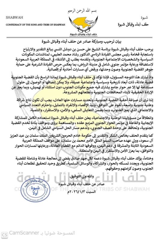 كما أكد حلف أبناء وقبائل شبوة دعمه لكل جهد صادق يفضي إلى معالجة عادلة وشاملة للقضية الجنوبية، وجدد تمسكه بالحوار، والشراكة، والوسائل السلمية، كطريق وحيد لتحقيق تطلعات أبناء الجنوب وصون كرامتهم وحقوقهم.