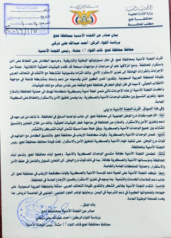 وقالت اللجنة في بيان صادر عنها برئاسة محافظ لحج اللواء الركن أحمد عبدالله علي تركي قائد اللواء 17 مشاة رئيس اللجنة الأمنية إن هذه الخطوة تأتي في إطار الجهود الرامية إلى الحفاظ على أمن المحافظة ومنع انزلاقها نحو أي صراعات أو مواجهات مسلحة قد تخدم جماعة الحوثي.