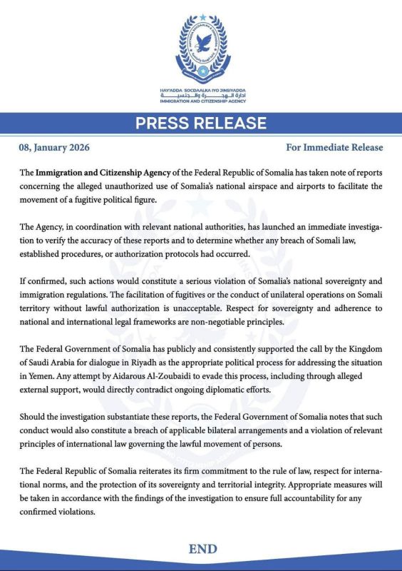 قالت هيئة الهجرة والجنسية في الصومال إنها علمت بتقارير عن استخدام غير مصرّح به للمجال الجوي والمطارات الصومالية لتسهيل تنقّل شخصية سياسية مطلوبة.