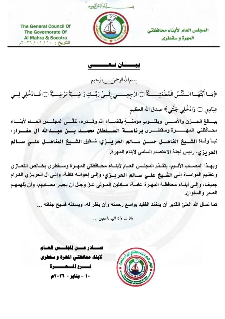 وقدم المجلس العام خالص التعازي وعظيم المواساة إلى الشيخ علي سالم الحريزي، وكافة إخوانه، وآل الحريزي الكرام، وأبناء محافظة المهرة عامة في هذا المصاب الأليم.
